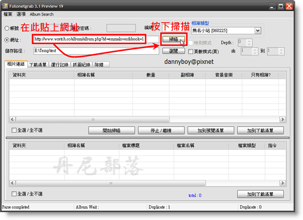Fotonetgrab 使用教學 3/3一、先準備軟體可至此篇下載:http://blog.pixnet.net/dannyboy/post/20458373下載後解壓縮,執行裡面的『Fotonetgrab.exe』二、取得 無名 網路相簿的相簿網址三、貼在剛剛啟動的 Fotonetgrab 程式中,並按下掃描四、確認勾選了欲下載相簿,按下『加入下載清單』五、換至『下載清單』分頁,按下『開始下載』 相關資訊:前往 無名 相簿可直接搜尋相簿→http://www.wretch.cc/album/...